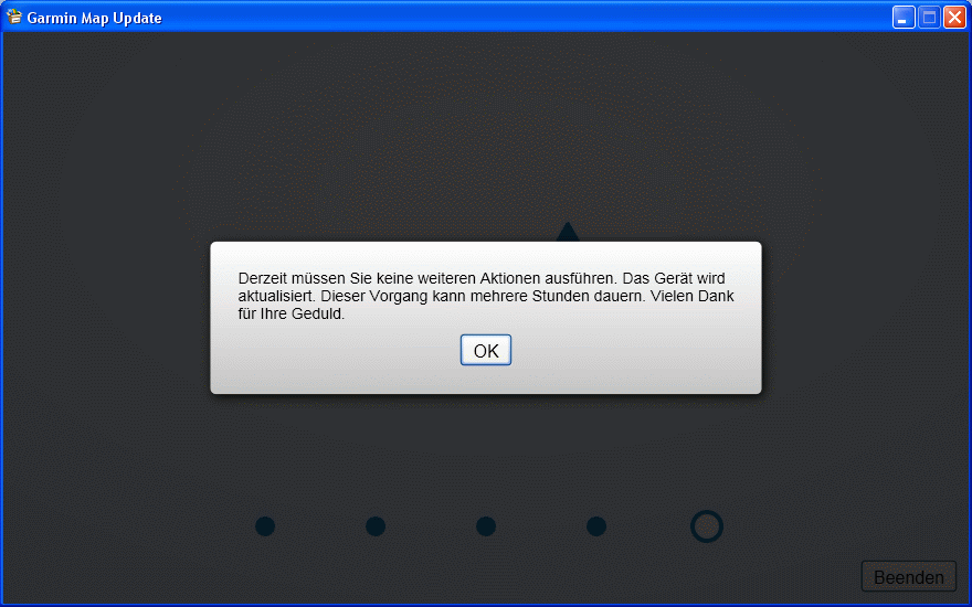Eben habe ich auf den OK-Button gedrückt, dachte mir, ist halt kaputt, breche ich's ab ... da sagt er mir: Update abgeschlossen. Oh Mann, wie stifte ich als Programmierer maximale Verwirrung - Garmin hat's drauf.