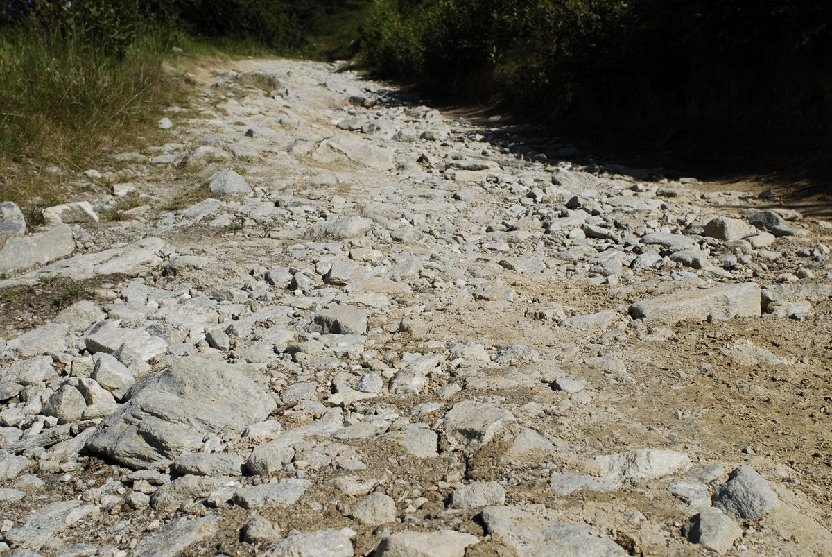 Geholt habe ich mir das Problem auf der Varaita-Maira-Kammstraße, die unerwarteter Weise deutlich schwieriger als die LGKS zu befahren war. Die heftigen Passagen mit großen treppenartigen Gesteinsbrocken oder "Schotter" in Tennis- bis Handballgröße sind dort heftiger und 3 bis 4 mal so lang wie auf der LGKS. Erst hinterher habe ich im Buch "Westalpen mit dem Motorrad" zu dieser Straße lesen können: "es galt unterwegs einige Streckenabschnitte in Trailtechnik zu überwinden".
