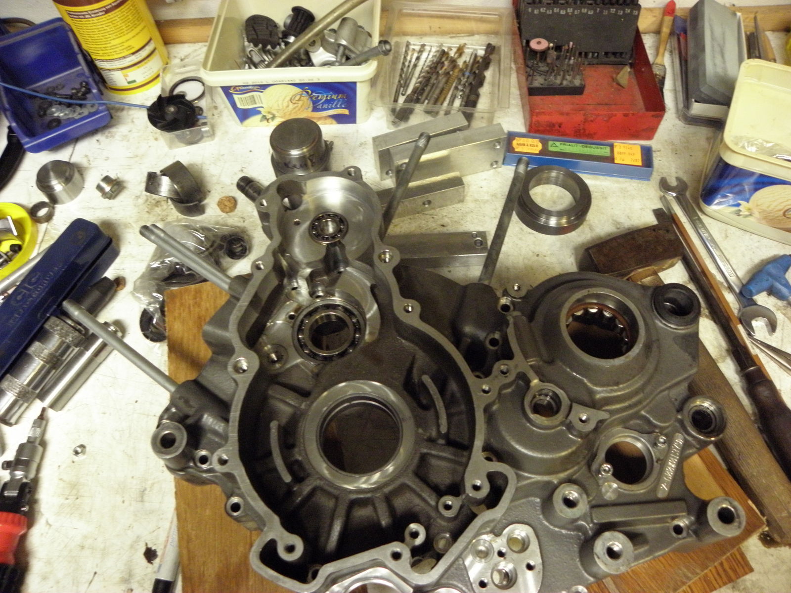Meine verständnisvolle Frau hat mich das Ganze in der Küche erledigen lassen, zum Erhitzen habe ich den Backofen verwendet, 150° lt. RepAnleitung waren aber zu wenig ab 180-190 sind auch die kleineren leichten Lager wie beschrieben durch fallenlassen des Gehäuses auf eine Holzplatte sebständig rausgefallen und zum Einpressen der neuen Lager habe ich diese zwischenzeitlich tiefgekühlt, nur die Hauplager hab ich in der Garage getauscht, das ist ein mittelmäßiger Kraftakt...