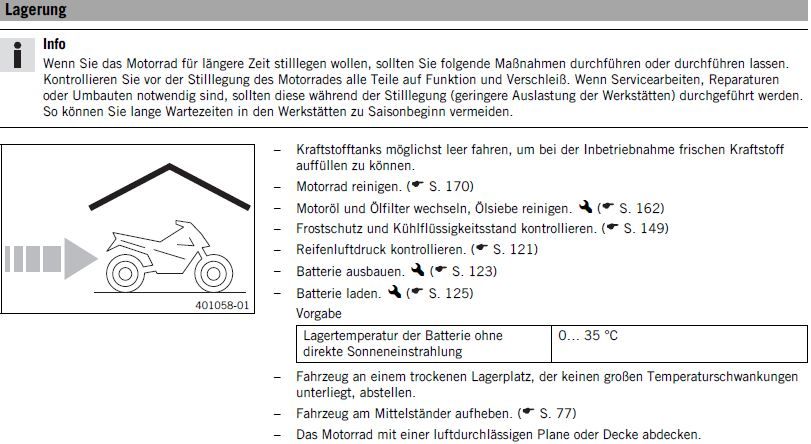 Früher hat es mal geheissen, Tank praktisch leer fahren, Kraftstoffhahn zu, Vergaser leer laufen lassen, Batterie raus und beide Räder in der Luft. Ist das bei diesen modernen Einspritzern nicht mehr so?