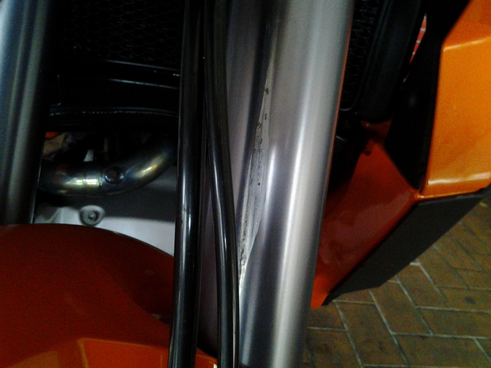 Moin, beim reinigen meiner 950´ADV ist mir aufgefallen das sich der Kotflügel vorn in die Gabelholme eingearbeitet hat. Nunja die Befestiegung unten und hinten ist nun mal nicht so star fest. Jedenfals muß ja der Koti so gegen die Gabelrohre gedrückt haben, durch den Farhrtwind wie ein Segel , und das ständige einfedern um die langen Kratzer zu verursachen.