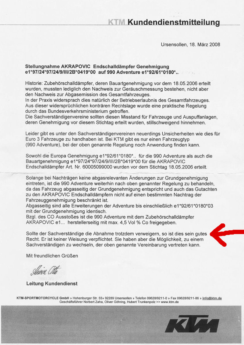 Für den Akra-Auspuff gilt dasselbe: 4.5 % CO-Gehalt sind erlaubt (siehe oben), das ist der Grenzwert für einen Auspuff ohne Kat. Mit Kat wären's 0.5 %.