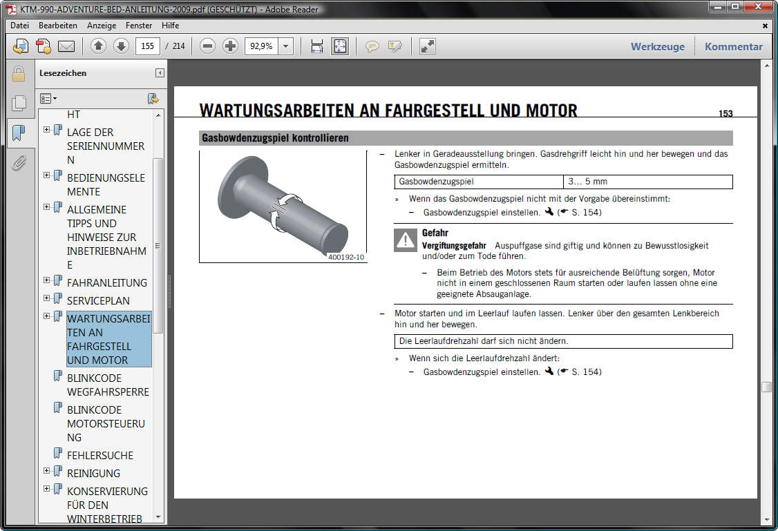Wenn die (in etwa) 2-5mm Spiel nicht stimmen, dann aber nicht gleich selber nachjustieren! Davon hängt die Drossel-Klappen-Nullstellung ab. Das Justieren nur in einer KTM Werksatt machen lassen!!!!!