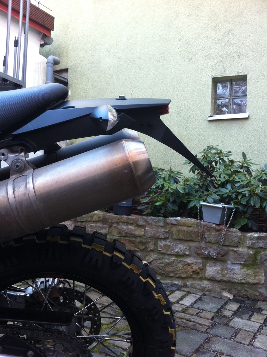 Da mir das plumpe Heck nie gefallen hat, aber ein Umbau mit Alu auch nicht so gefallen wollte...hab ich mal in die PP-Kiste gelangt, den Lötkolben ausgepackt, nen neuen Kennzeichenhalter bestellt und nen universelles Sportheck mit E-Prüfzeichen (hab ich auch auf der DR Big und DR350 montiert...noch nie Probleme gehabt) aus dem Lager geholt, Säge frei und losgelegt.