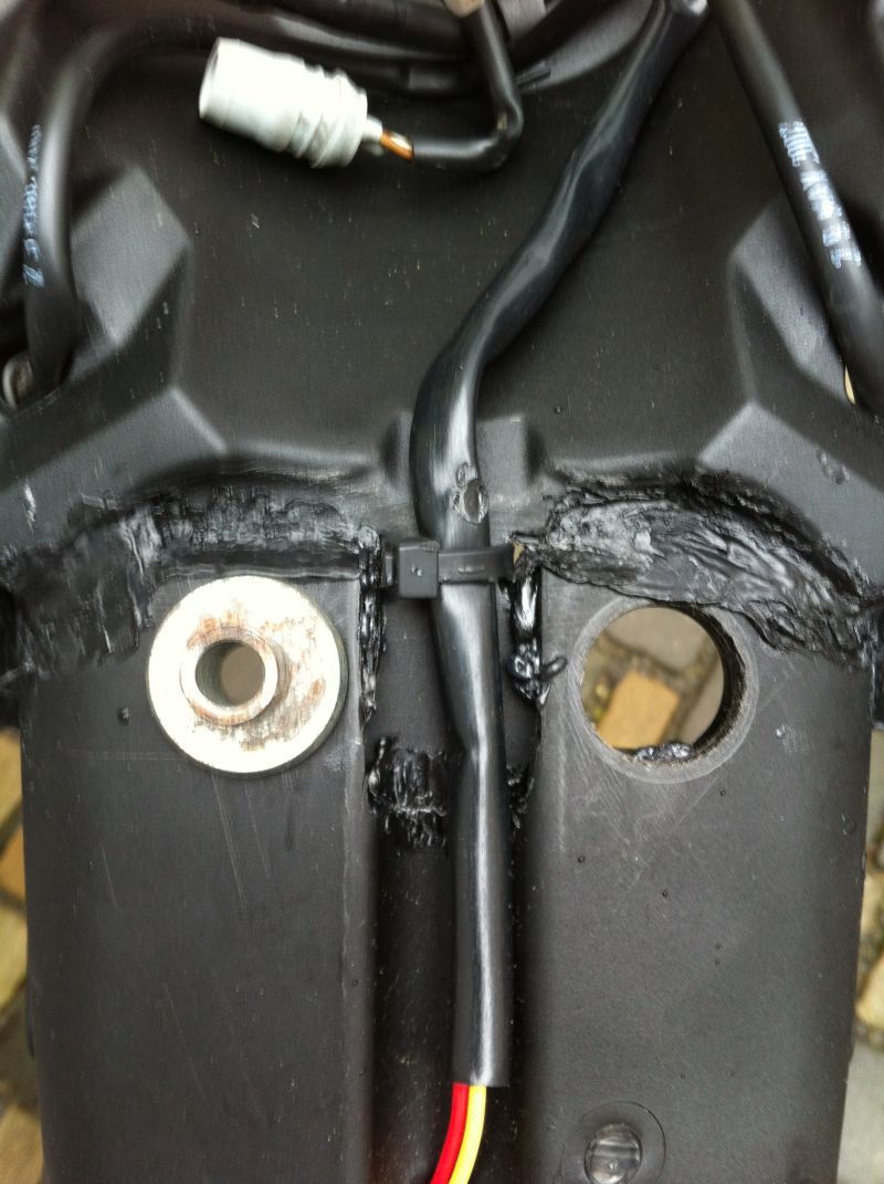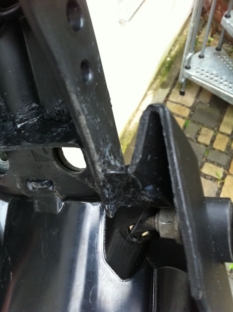 Blick von unten. Gut zu sehen der originale Teil der das Loch unter der Sitzbank abdeckt und das angesetzte LED-Heckteil