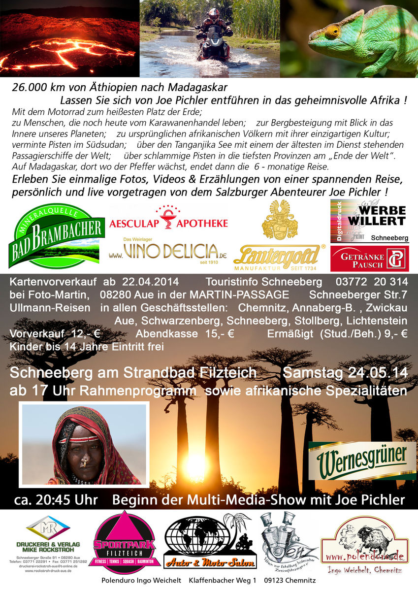 24.05.2014 18:00 Uhr Fernweh am Filzteich mit Joe Pichler / Abenteuer Afrika (Beginn des Vortrags ca. 20:45 Uhr) / Open Air mit Überdachung / im Filzteichgelände Schneeberg , 08289 Schneeberg (im Rahmen des MET6)