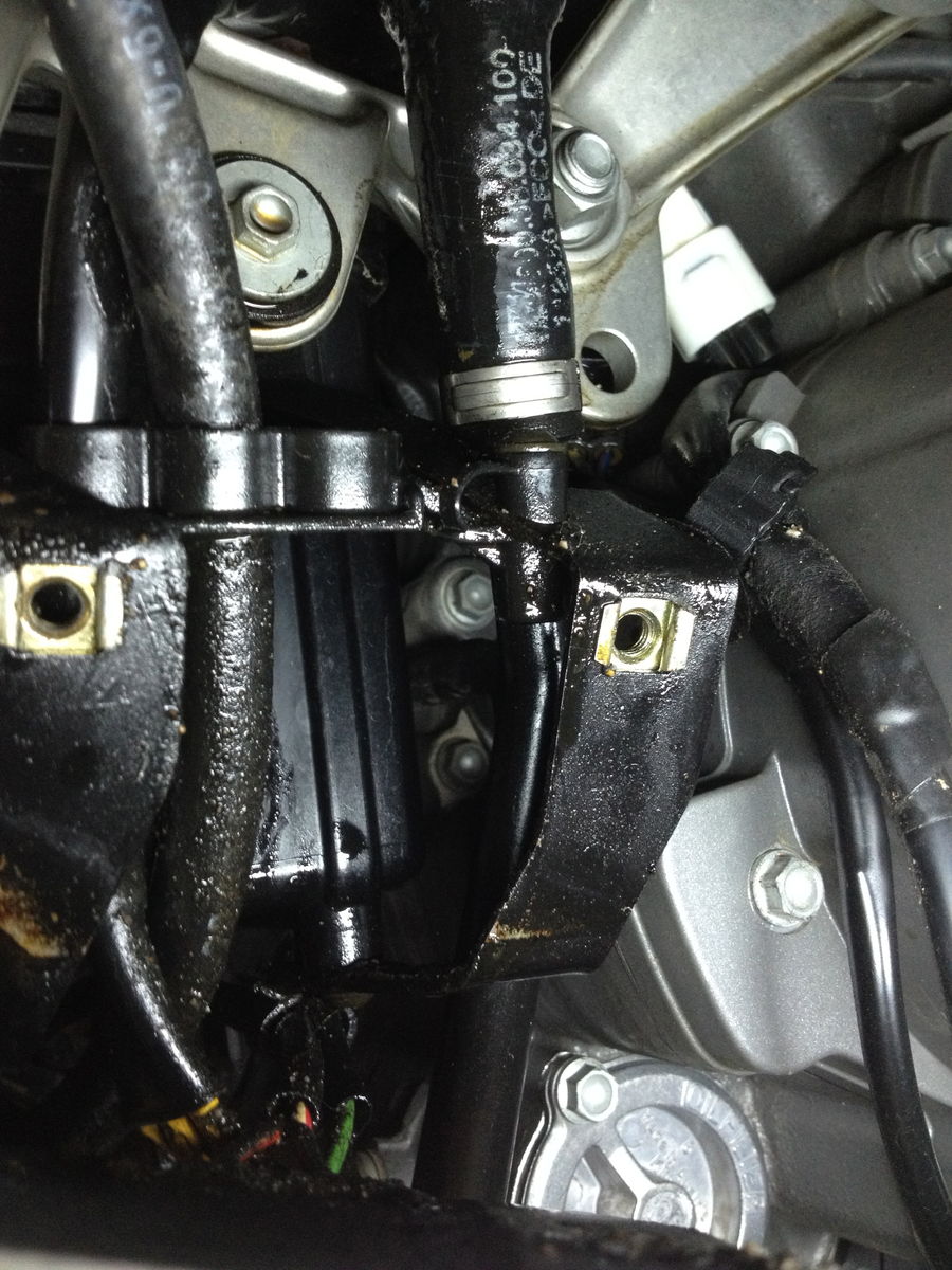 Wenn beim Ölnachfüllen etwas daneben geht und das Motorrad anschließend auf dem Seitenständer abgestellt wird, läuft das Öl am Öltank entlang von rechts nach links zum Ölrücklaufschlauch. Das sieht dann so aus, als ob dort etwas undicht wäre.