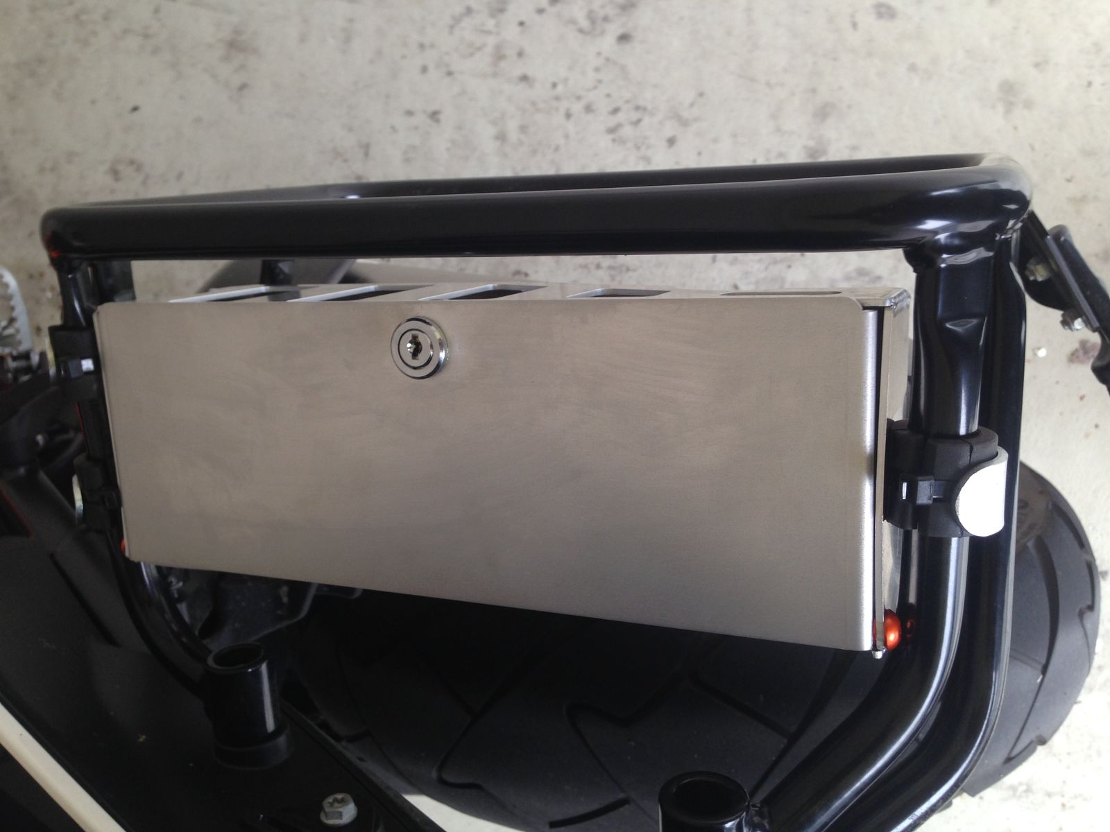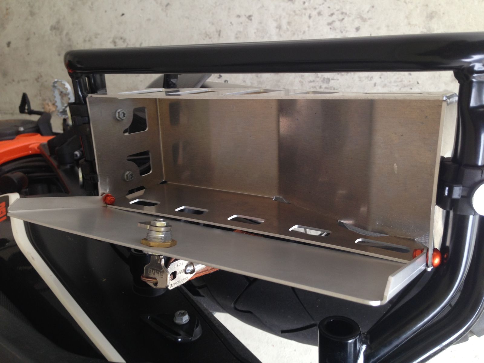 Ich habe mir beim Kauf der Adventure diese Zubehörbox für die Kofferträger gekauft, diese Box ist ja nur eine Aluschale bei der man höchstens im Stand was reinlegen kann, weil diese ja oben offen ist, da mich das schon von Anfang an nervt und ich zumindest das Kettenschloss, oder ähnliches darin transportieren möchte, habe ich einen Deckel dazu kostruiert und gebaut, die Serienbox muss zwar auch leicht bearbeitet werden (Rückseite etwas ausschneiden, Vorderseite mit Schitz für Schlossriegel versehen), aber danach passt das ganz gut und funktioniert auch einwandfrei, nun ist es eine gelschlossene Box die auch zum Transport wärend der Fahrt geeignet ist, sollte jemand Interesse haben, kann ich gerne den Datensatz fürs 3D Model schicken, dann kann das eigentlich jeder der Laserschneiden und kanten kann nachmachen.