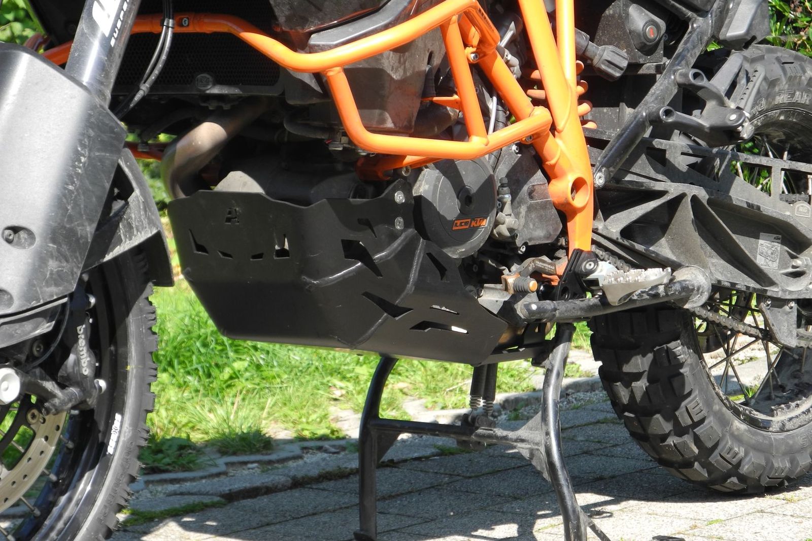 Die Montageanleitung ( siehe Anhang ) ist zwar in Englisch, ist aber für jeden „Schrauber“ dennoch leicht verständlich. Es sind sogar 2 neue Splinte für die Fußrasten** dabei. Der ganze Anbau ist relativ einfach und in 30 - 45 Minuten erledigt. Des Weiteren ist mir aufgefallen, dass der Motorschutz meines Erachtens die Motorgeräusche nicht negativ beeinflusst wie der PP Motorschutz von KTM oder der von TT. Gut das kann jetzt meine subjektive Wahrnehmung sein, aber ich habe noch das „gruselige“ Geräusch vom PP Motorschutz in den Ohren ;-) den ein Freund an seiner 1190 R montiert hat.