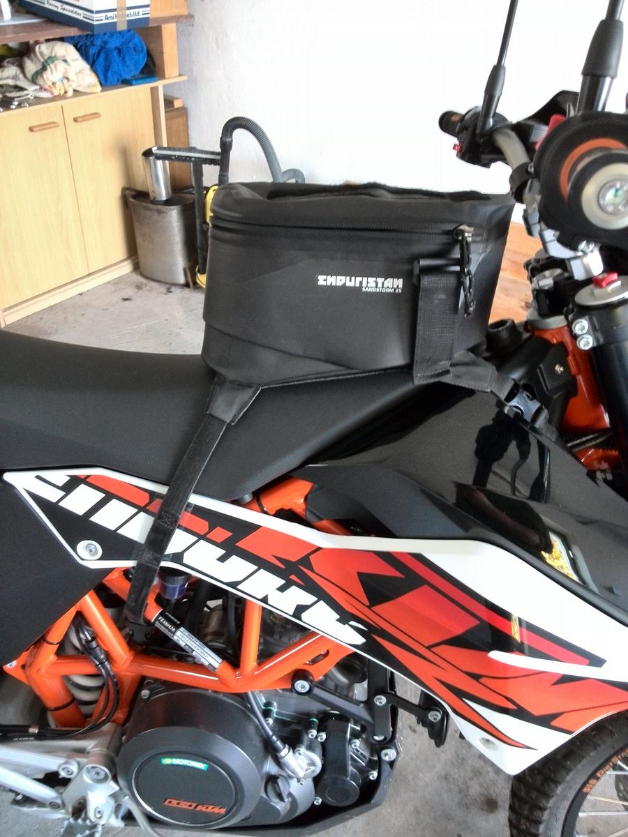 Platz ist ja Mangelware auf der 690er, ich hab mir den kleinen Enduristan Sandstorm gekauft, da bringst alles für einen Tagestripp rein, stört auch beim Geländefahren nicht.