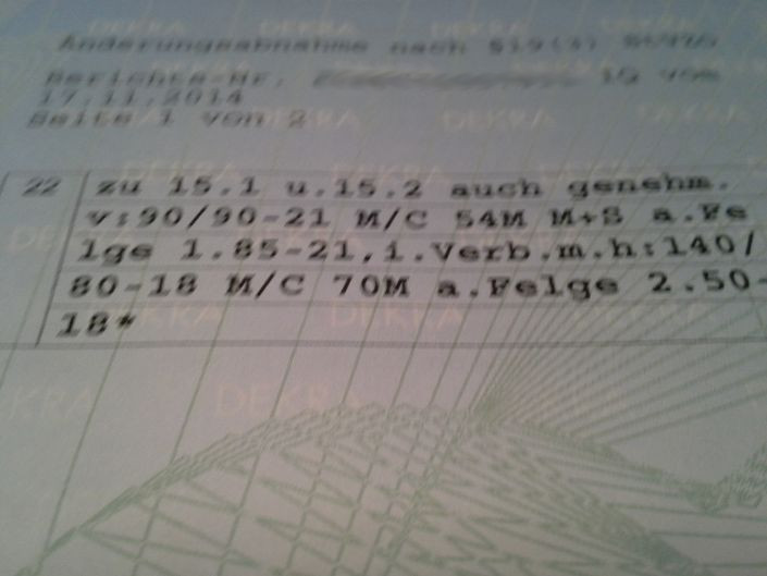 5.So in unserem Fall haben wir nun Felgen/Räder, die nicht auf der 950 Adventure serienmäßig zu haben sind,. sondern auf anderen KTM Modellen wie der Rally oder der SE. Das ist schon mal ne gute Sache, weil diese Motorräder, um für den Markt zugelassen zu werden, schon mal geprüft wurden inkl. Ihrer Räder/Reifen/Felgen. Bedeutet wir haben ein „Prüfzeugniss/ Prüfprotokoll“ darüber, das wir dem Sachverständigen vorlegen können, und mit dem dieser arbeiten und seinen Sachverstand walten lassen kann (wenn er denn will). Hat nichts mit Eiern zu tun, sondern mit Sachverstand.