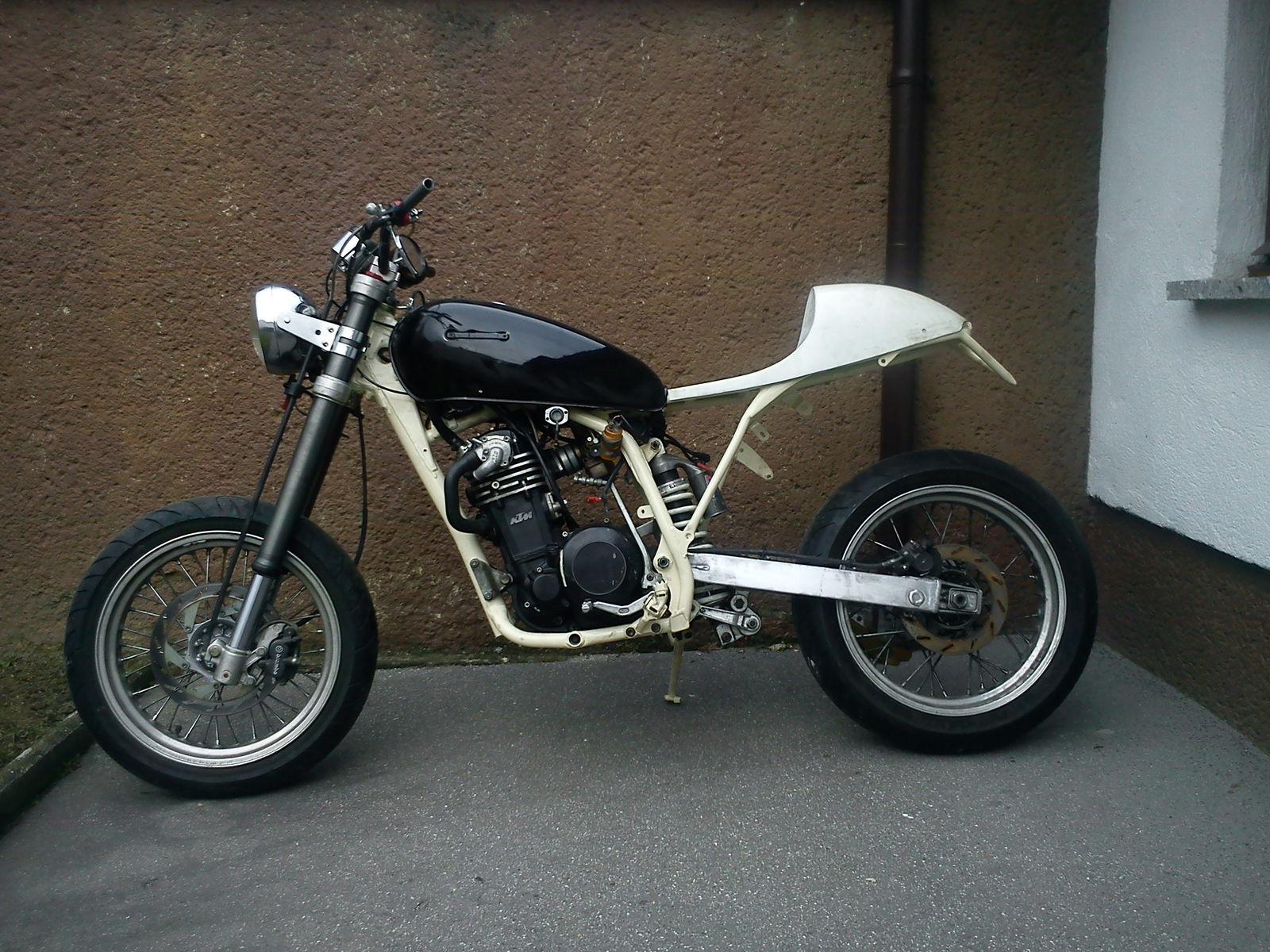 Ursprünglich handelte es sich bei der Maschine um eine äußerst grindige 91er LC4, die sichtlich nicht gerade in den Brunnen der ewigen Schönheit gefallen ist. (siehe Foto) Da sie aufgrund ihrer graziösen Optik und der brachialen Leistungsentfaltung des gefühlten 20 PS Triebwerks (ohne Ausgleichswelle wohlgemerkt) vermutlich nicht einmal die Ungarn bei der "Sperrmüllabholung" mitnehmen würden... habe ich kurzer Hand beschlossen, i bastl afoch wos Lustiges draus! Nachdem ich das Moped gestrippt und alle KTM Plastics blitzartig entsorgt hatte, montierte ich vorerst provisorisch anstelle des originalen Kunststofftanks den Blechtank einer alten Yamaha XS400 und anstatt der KTM Lichtmaske einen verchromten Scheinwerfer (ebenfalls einer XS400). ...sah schon ganz witzig aus, aber noch lange nicht wie ein "altes klassisches Motorradl. Um optisch einen "luftgekühlten Look" zu erzielen, habe ich den rechten Wasserkühler (ab Werk vorne am Rahmenbrustrohr verbaut) im Heckrahmen unter dem Sitz verbaut. Natürlich werden jetzt gleich alle aufschreien: "Ein Wasserkühler im Heck bringt weniger Kühlleistung als zwei Kühler an der Front" Richtig, die Kühlleistung eines Wasserkühlers im Heckrahmen ist natürlich nicht so effektiv wie die zweier Kühler an der Front, jedoch kann ich bestätigen, dass der Wasserkühler im Heck aufgrund der langen Kühlwasserleitungen unter "normalen Bedingungen" völlig ausreicht und sich ausschließlich im Stadtverkehr bei längeren Stehzeiten ohne Fahrtwind hie und da mal a bissl anspeibt!