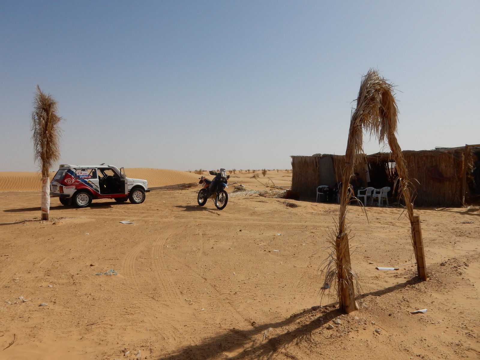 Schon der erste Tag hat mir die Grenzen aufgezeigt, 1km vorm Ziel bin ich förmlich vom Motorrad gefallen. Völlig dehydriert und konditionell am Ende bin ich ins Ziel gelaufen. Am Nächste morgen musste ich erst noch die Antenne vom Trecker tauschen und das Roadbook kleben, so bin ich zu spät zum Start gekommen. Die Dünenpassage dieser Etappe habe ich ausgelassen, was nicht nur für meine Kondition eine weiße Entscheidung war. Der Sand erwies sich als so schwer fahrbar, dass alle, die die Passage gefahren sind, nicht in der Vorgabe ins Ziel gekommen sind. Der Berge-LKW hatte bis zum nächsten Tag noch zu tun, um einen liegengebliebene G-Klasse zu bergen. So wurde die 3 Etappe vom Org-Team gekürzt und ohne Dünen gefahren. Damit waren nur Pisten zu meistern und die Kräfte wurden geschont. Bei über 35grad ging es dann in der 4. Etappe größtenteils durch Dünen, was bei der Temperatur zur Tortur wurde. Ich habe, wie einige andere auch, nicht einmal den Exit-Punkt erreicht. Die 5.Etappe nach Douz wurde von der Orga gekürzt. Somit konnten wenigsten 4 Teams das Ziel in Vorgabe erreichen. Ich war dabei, habe aber einen Dünen-Gürtel umfahren und entsprechende Strafzeit in Kauf genommen. Endlich Ruhetag,es wird viel geschraubt, bei mir blieb es bei Luftfilter wechseln und Öl nachfüllen. Beim Tschechischen Buggy wurde sogar das Getriebe komplett zerlegt. Die zweite Woche begann mit Dünen. Bis zum Exit wollte ich kommen, leider hat nach 10km im Sand mein Vergaser Probleme gemacht, nur noch Standgas ging und tuckern im ersten Gang. Wenn Leistung benötigt wurde ist sie einfach abgestorben. Der Berge-LKW hat mich rausgeholt und ich bin dann mit eigener Kraft zum Start zurück. Der Berge-LW musste auch noch der Tschechische Buggy holen. Am Start war fester Untergrund, geeignet zum Schrauben. Tank ab, Vergaser öffnen, siehe da der Schieber klemmt. Hat wohl doch schon einiges an Sand abbekommen. Dann bin ich über die Straße nach Ksar Ghilane gefahren. Die nächsten zwei Tage ging es zum Verlorenen See und zurück. Bis 4km vorm See bin ich gekommen. Es war sehr anstrengend, weil der Sand sehr schwer zu fahren war, aber es ging vorwärts. Dann lief die Maschine nicht mehr im Standgas und klang nach Ölmangel. Kurze Kontrolle, Öl ist unter Minimum. Also wieder Berge-LKW. Er war schnell da, fuhr er ja kurz hinter mir. Nur noch der Lada war mit mir zusammen unterwegs, Quad und Buggy sind schon am See angekommen. Alle anderen haben vorher abgebrochen. An einer Steilstufe wurde der Lada mit der Winde über die Hürde gebracht. Alles andere hat er aus eigener Kraft geschafft. Nach Einbruch der Dunkelheit waren dann alle am See. Die Rückfahrt erfolgte für mich auf dem Berge-LKW, die anderen fuhren in Wertung. Dann ca. 10km nach dem See, ein lauter Schlag, angehalten und das Schlamassel angesehen, die oberste, führende Lage der Feder ist gebrochen. Mit Holzklotz und Spanngurt wurde eine notdürftige Reparatur durchgeführt und es ging sehr langsam weiter. Den Lada und die anderen Orga Fahrzeuge mussten wir ziehen lassen. Bei Einbruch der Dunkelheit hatten wir die Dünen hinter uns gelassen, aber zum Camp schafft es der Berge-LKW nicht. Ich bin dann mit einem anderen Orga-Fahrzeug nach Douz, dem Ziel für die nächste Etappe gefahren. Der Berge-LKW blieb stehen und hat erst am nächsten Morgen die Fahrt nach Douz fortgesetzt. Hier hat die Orga ihr ganzes Können gezeigt, um für alle beteiligten einen vernünftige Lösung zu finden, denn es waren noch weitere Fahrzeuge ausgefallen. Ich konnte zwar die vorletzte Etappe nicht fahren, aber es sind die gesamte Ausrüstung und alle Fahrzeuge nach Douz gekommen. Öl Nachfüllen und Luftfilter wechseln, und schon ließ sich meine Maschine überzeugen, dass sie mit mir durch das Ziel fährt. Zur letzten Etappe sind dann noch alle verbliebenen 6 Wertungsfahrzeuge angetreten. Es war eine sehr schnelle 80km lange Piste, bei der Überholen fast unmöglich war. Vom Ziel ging es dann noch 400kmauf Straße bis zum Hotel nach Hammamet, das ist auf einer Enduro nicht gerade ein Höhepunkt. Eine ¼ Liter Öl hat meine Maschine dabei verbraucht, … da ist doch einiges an Sand in den Zylinder gekommen.