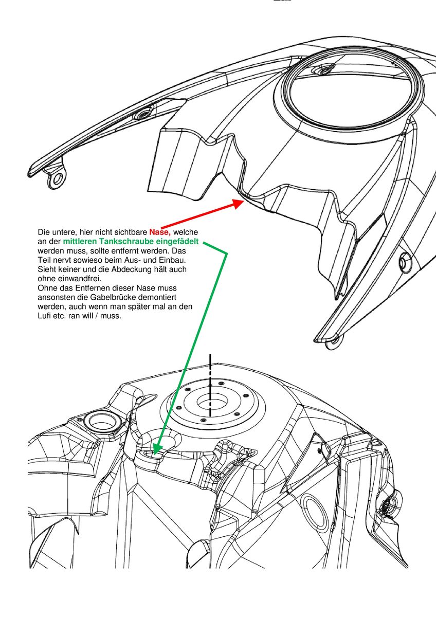 Man muss nichts bohren, wie beim vergleichbaren Scott oder Öhlins. Allerdings muss die kleine schwarze Gummiabdeckung am Rahmendreieck (ab Bj.16 Serie) raus und man sollte die vordere Haltenase der Abdeckung wegschneiden, sonst muss man die obere Gabelbrücke zum Einbau des LD und immer wenn man die Abdeckung abnehmen muss immer aus- und einbauen, es sei denn RalleMoto hat hier einen anderen mir unbekannten Trick. Ich hab halt einfach die nervige Nase "weggedremelt".