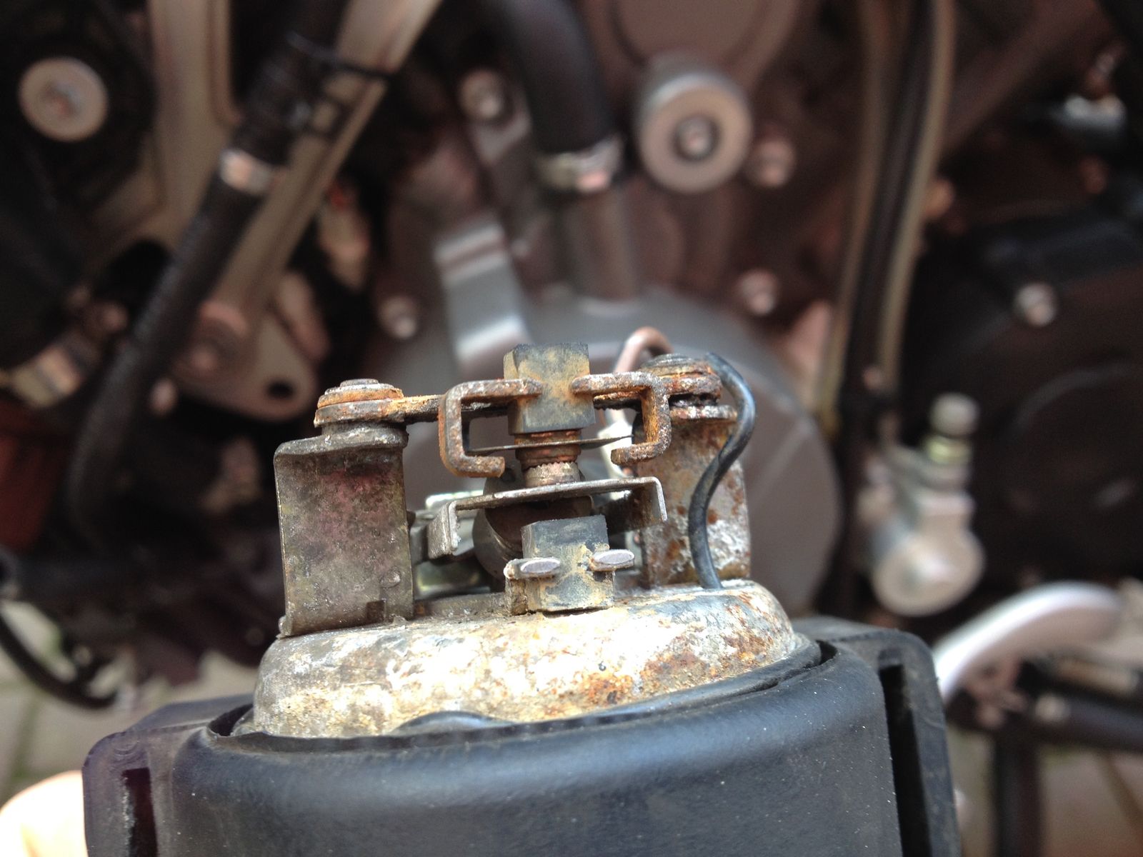 Die Kontakte sind derart korrodiert, da würde ich erstmal die Pumpe instandsetzen und schauen, ob sie dann läuft. Erst wenn sie das wider Erwarten nicht tun sollte, würde ich das Benzinpumpenrelais ausbauen und prüfen (hinterm Scheinwerfer in Fahrtrichtung gesehen das linke der beiden Relais). Beim Einsetzen der Pumpe in den Halter passiert es leicht, daß der Deckel sich etwas verschiebt und unbemerkt undicht wird, also sorgfältig arbeiten bei der Wiedermontage. Den kurzen, transparenten Entlüftungsschlauch habe ich an meiner 950S verlängert und ganz nach oben an den Lenkkopf geführt, mit einem kleinen Bogen abwärts.