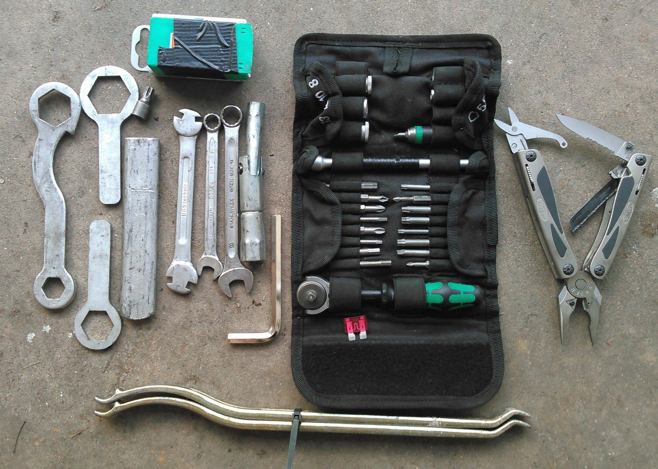 Ich denke Ihr habt die gleichen Schrauben verbaut wie ich an der SE. Da hilft das angehängte Set für alles was Du unterwegs richten kannst. Passt in einen IKEA Kulturbeutel (bis auf die Montiereisen), Grundstock ist die WERA Tasche. Die reicht natürlich nicht alleine, aber die Nüsse (6-13), Imben und Torxe decken schon viel ab und nur wenige Bits sind für die LC8 unnütz.