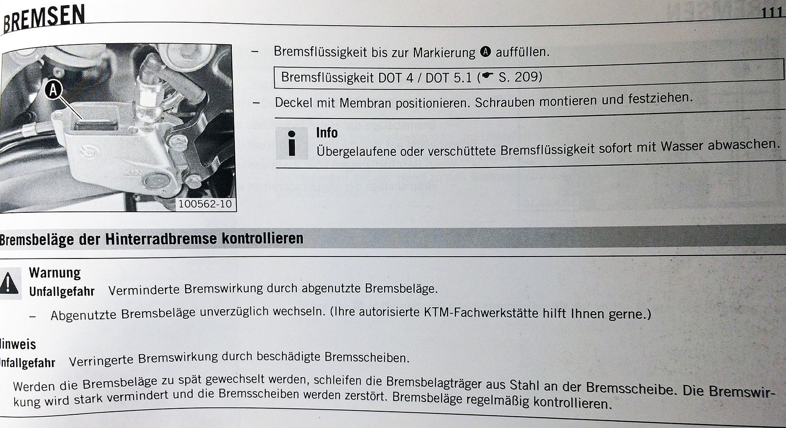 Meine oben gepostete Info habe ich leider nicht mehr schriftlich zur Verfügung, da ich nicht mehr in der KTM-Werkstatt arbeite. Es handelt sich um die Arbeitsanweisung von KTM zum internen Gebrauch in den Vertragswerkstätten, zur Montage der Umrüstkits U1 (das erste, komplette Kit) über U2 bis U3 (die Teilkits) für die Hinterradbremse. Wir Mechaniker haben demnach die Bremsflüssigkeitsbehälter so befüllt, daß beim Einschieben der neuen, schwertförmigen Membran BF auslaufen mußte und keinerlei Luft unter der Membran verblieb. Diese damals neu eingeführte Membran reicht wie ein Schwert bis fast auf den Boden des BF-Behälters. Sie ist innen hohl und kann das Volumen der unter Hitze sich ausdehnenden BF ausgleichen.