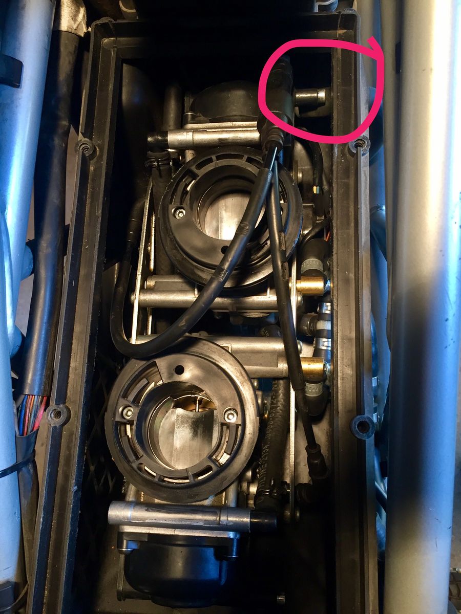 Die Membrananschlüsse der Vergaser sollten ja eigentlich mit den EPC Ventilen verbunden sein. Davon ist der Schlauch des Vergasers mit der verbogenen Drosselklappe aber nicht angeschlossen sondern hängt lose daneben. (Auf dem Foto rot eingekringelt, den unteren Schlauch hatte ich schon abgezogen).