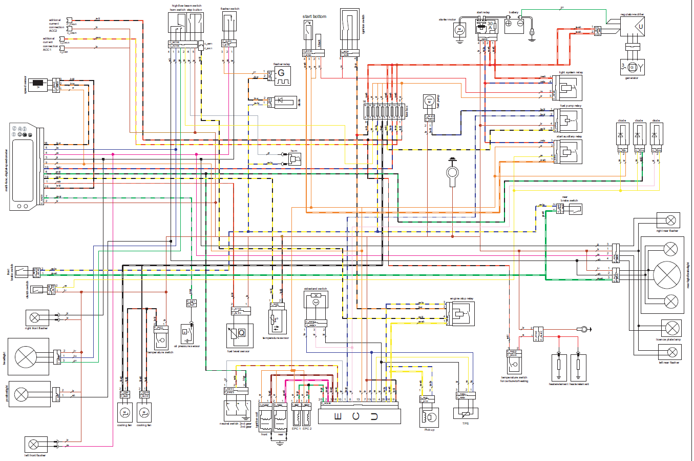 Überm Tacho ist der Speed Sensor gezeichnet. Wenn du einen anderen Tacho nehmen solltest, kann es sein das er das Signal nicht verarbeiten kann. Der org. Tacho benutzt , ,so weit ich weiß, einen Hallgeber und der Sensor benutzt die Bremsscheibenschrauben als Signal.