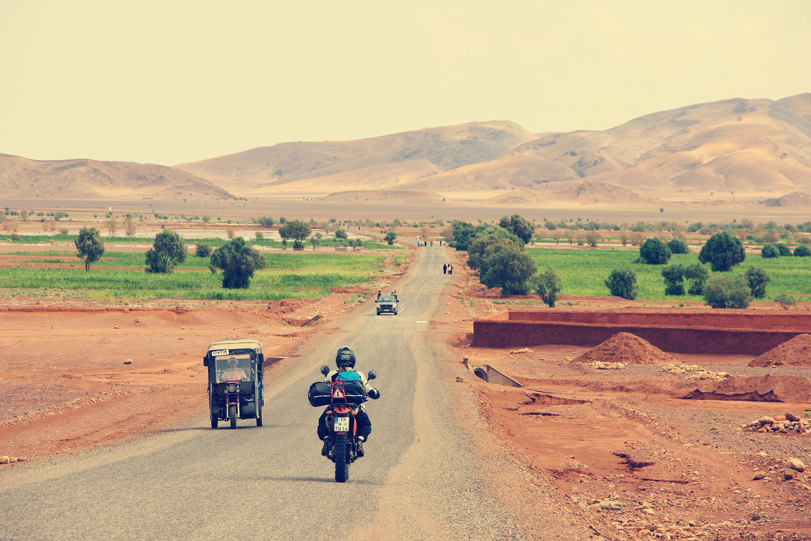 Kaum geschlafen, starke Kopfschmerzen und Abstieg. Gegen 10:30 im Dorf, Hubschreiber kreisen im Toubkal Gebiet, sicher eine Bergrettung. Zurück auf den Maschinen kündigen dunkle Wolken im Süden über den Bergen Regen an. Noch sind wir entfernt – aber wir müssen in diese Richtung. Heilfroh vom Berg unten zu sein. Wir folgen auf vielen Kurven dem Fluss Oued Nfis als starker Regen eintritt. Wir fahren durch kleine Berberdörfer. Arme sehr konservative Gegend hier, anhalten wollen wir nicht. Km-lang folgen wir einem westlichen SUV, irgendwie froh dahinter zu hängen. Vereinzelt sieht man Sturzfluten im von Dattelpalmen gesäumten Fluß münden. Wir überholen einen großen Radlader. 30min später stehen wir vor dem Ziel des Radladers. Mehrere Erdrutsche haben die Straße verschüttet. Viele Männer sind auf der Straße, verfolgen die Räumung. Man winkt uns als erstes durch. Irgendwann haben wir alle Pässe des Atlas hinter uns gelassen, fahren von 2100hm hinab und blicken in die Weite. Gelbe Steppe und roter Fels – auf einmal sieht alles nochmal anders aus, afrikanisch. Die Stimmung steigt, das Land fängt uns wieder ein.