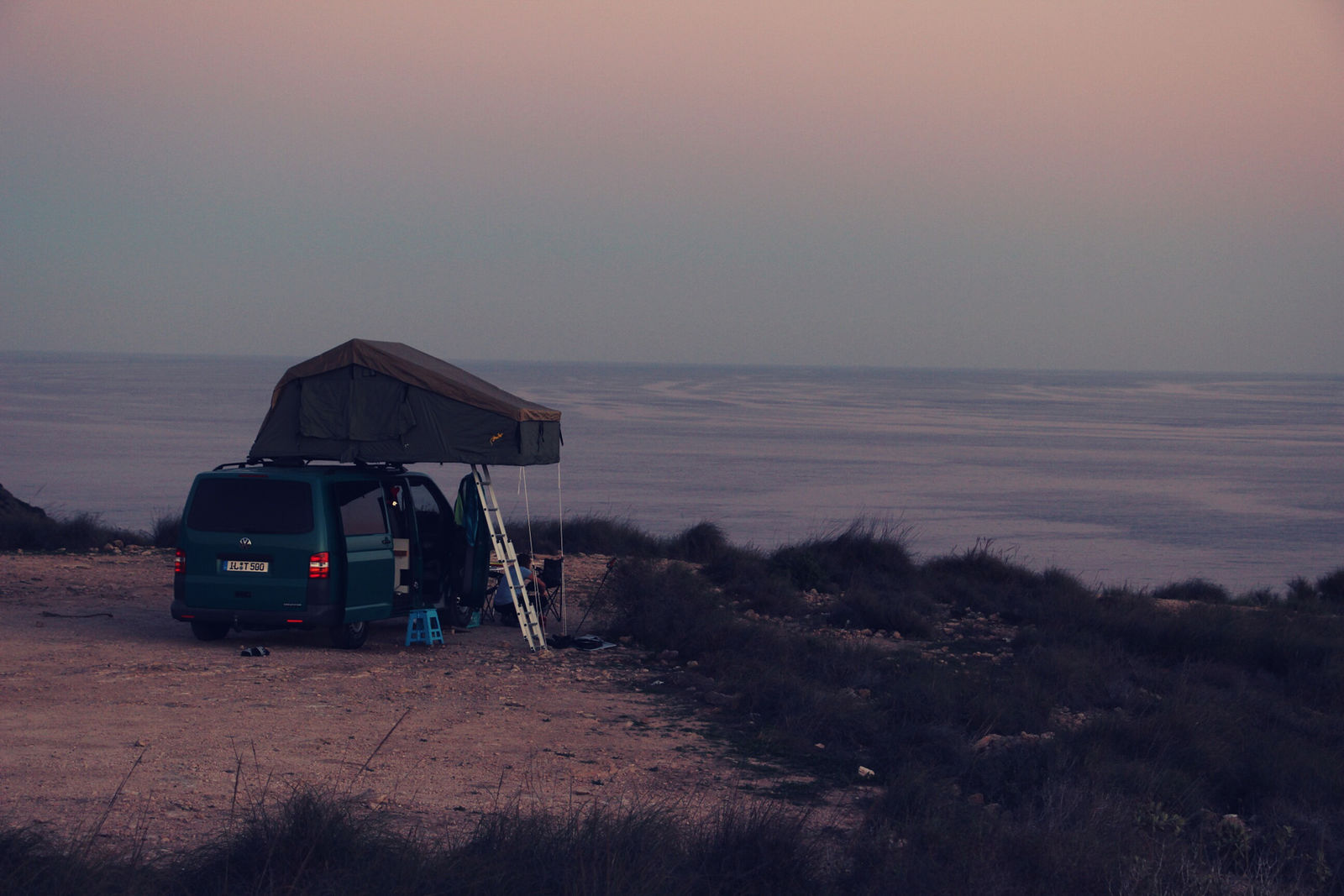 Der T5 ist mit allerhand Outdoor-, Küchen-, Überlebens- und Werkstattinventar sowie einer LC8 990 und LC4 640 gefüllt und obendrauf ist noch das Dachzelt gebunden.