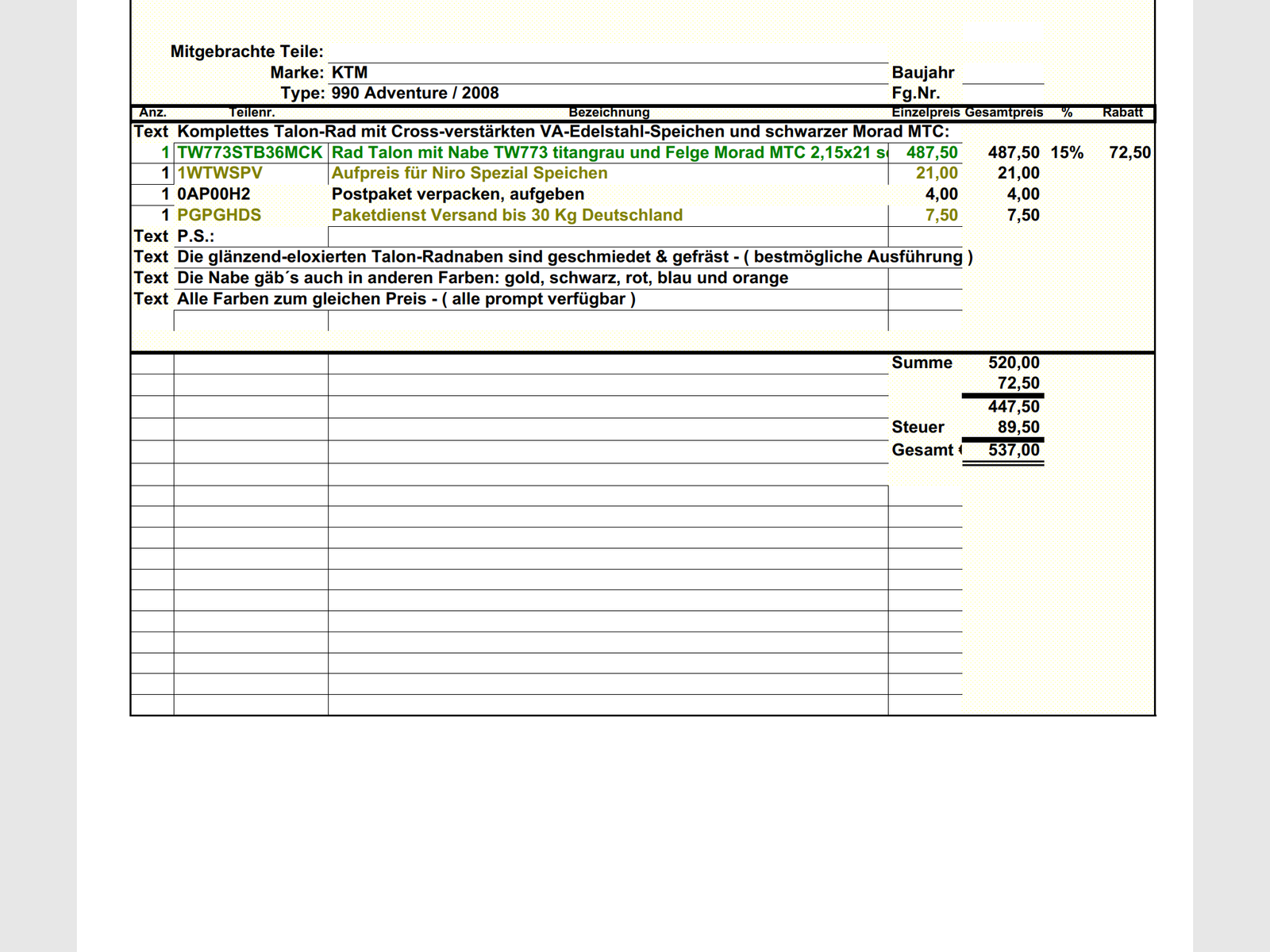 | Bagger @ Sa, 8. Dez 2018, 13:05 hat folgendes geschrieben: | | ...1 Alufelge 1,85x19 MTC ... |