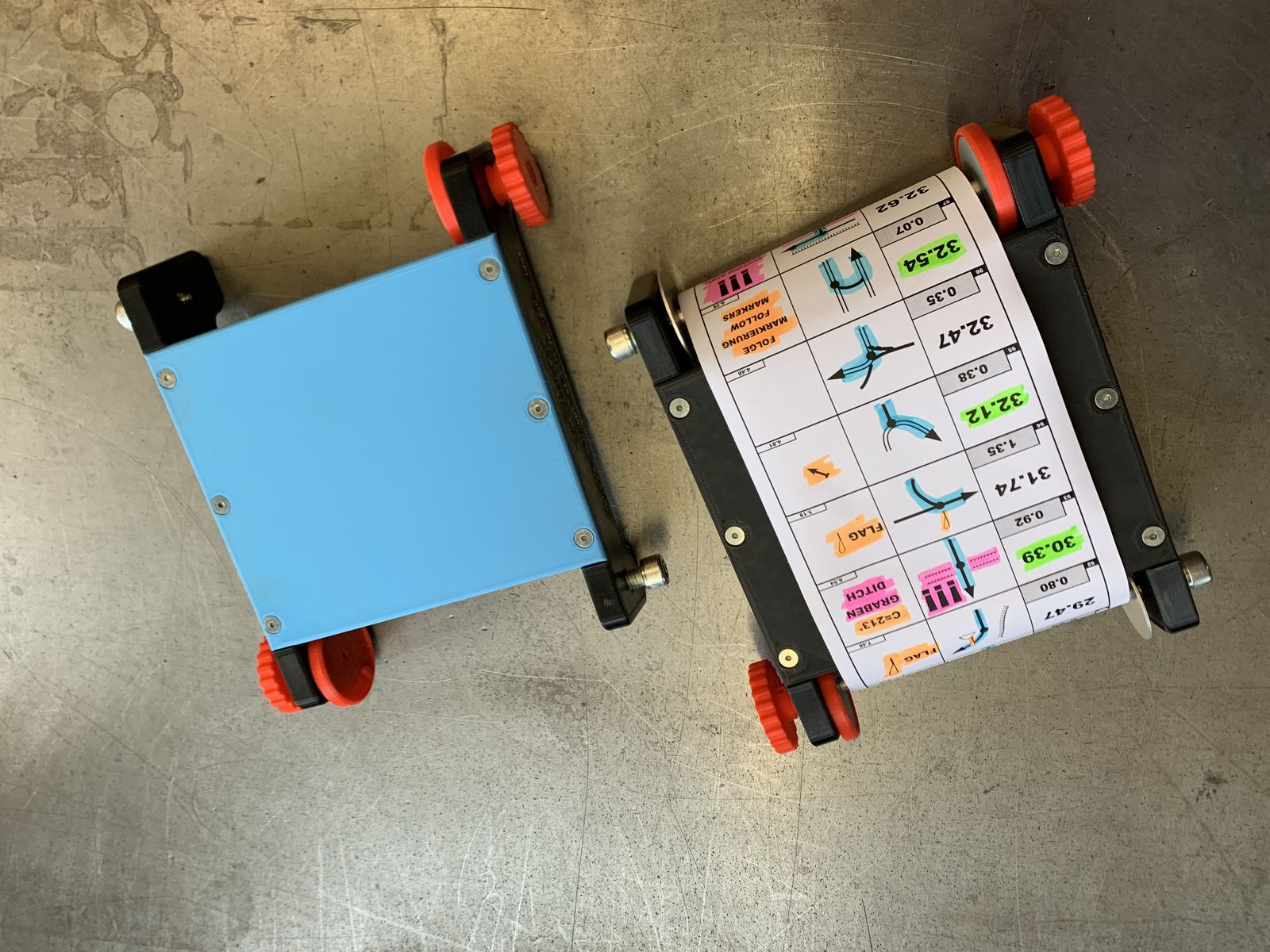 Hier ist es nun Möglich beide entnehmbaren Rollen des HRT 4.0 in den Reader einzulegen und das Roadbook zu makieren und anschließend einfach die komplette obere Rolle auf die untere Rolle zu spulen um diese dann ins HRT 4.0 einzulegen ohne Papiersalat.