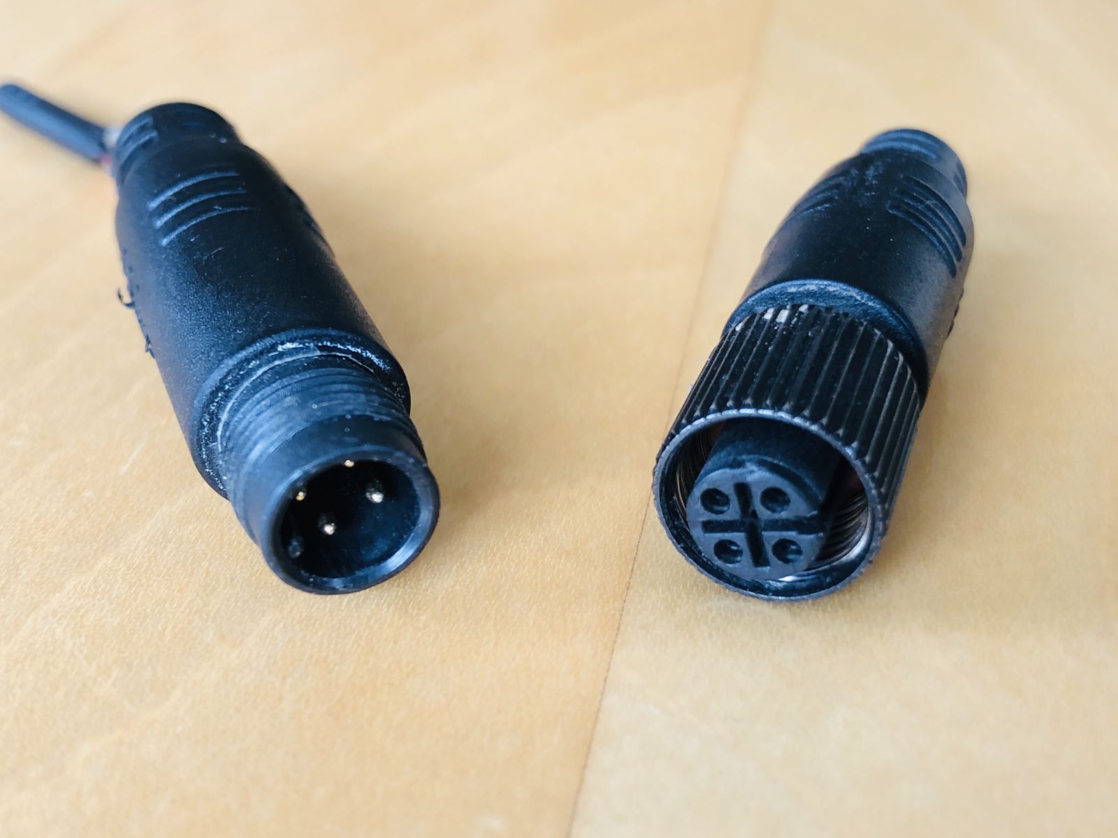 Bei einer älteren Cam war diese sehr filigrane (Durchmesser 10mm) verschraubbare wasserdichte Steckverbindung mit 4 Leitungen.