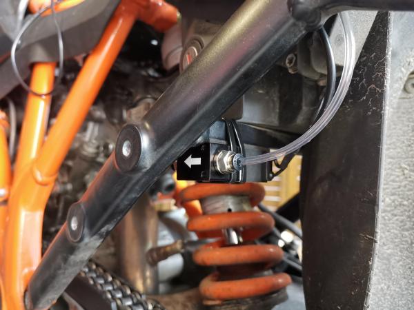 Das Dosierventil habe ich an die Rahmenquerstrebe hinter dem Federbein auf der linken Seite mit doppeltem Kabelbinder befestigt. Zwischen Dosierventil und Rahmen habe ich die mitgelieferte und von mir zugeschnittene Moosgummipolsterung geklebt.