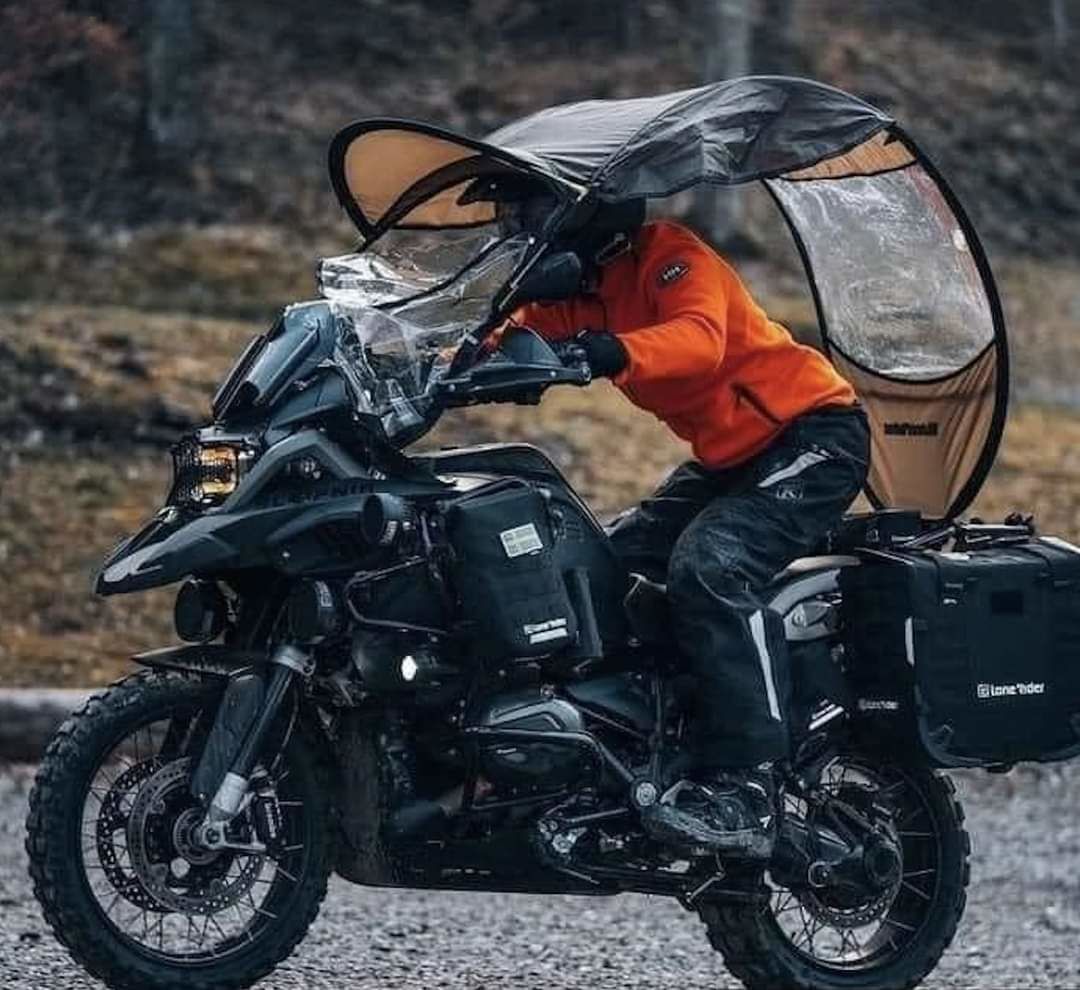 Anscheinend handelt es sich hierbei um eine Neuentwicklung von Lone Rider, den innovativen Abenteuerzubehörspezialisten. Bis zum Verkaufsstart des GS-Dachs sollte jedoch unbedingt noch die empfohlene Höchstgeschwindigkeit geklärt werden, damit die wasserscheue Kundschaft nicht plötzlich wieder oben ohne unterwegs ist...