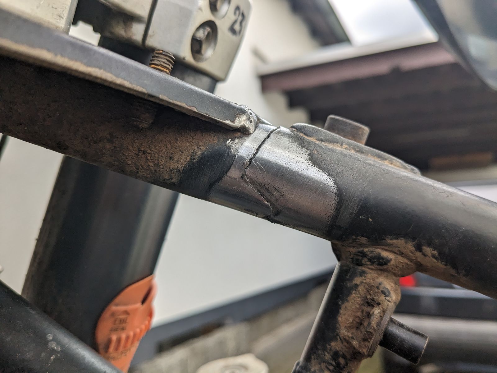 Schweißen wäre mir zu heikel gerade auch für eine Sportveranstaltung, nachdem beide Rahmenrohre durch sind war da viel Bewegung hinterm Lenkkopf. Wer weiß, was da noch unsichtbar schon geschwächt ist.