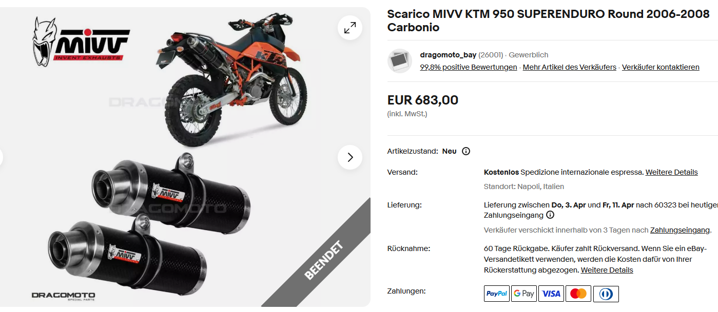 Ich wollte für meine Adventure die MIVV GP und hab auch diverse Angebote gefunden, konnte bestellen und per PayPal bezahlen => und jedes Mal kam DANACH die Info sie sind leider nicht mehr verfügbar, werden nicht mehr hergestellt und mir wird der Kaufpreis zurück überwiesen.