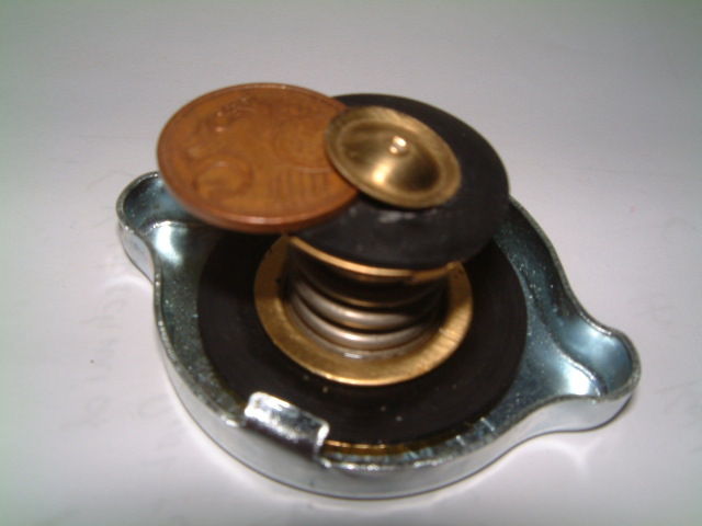 Aber leider ist es mir noch nicht klar. Der Kühlerdeckel dichtet einmal den Kühler komplett ab ("äußere Dichtung"). Über den Federdruck und den Teller wird eine zweite ("innere") Abdichtung erstellt. Zwischen den beiden Abdichtungen ist der Schlauchanschluss des Ausgleichsbehälters. Der Wasserdruck im Kühler öffnet die innere Abdichtung bei 1,4bar gegen die Federkraft.