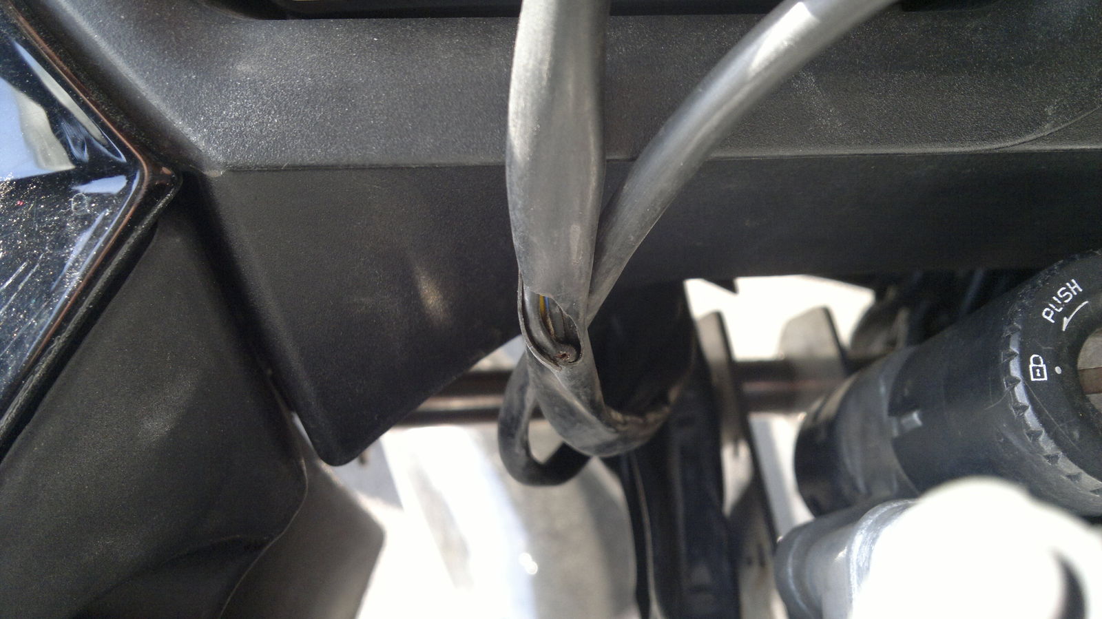 Alternativ: Plastikklemme abschneiden, falls man viele Zusatzkabel zum Lenker hat (Fernbedienung Tacho, Heizgriffe, Audio, Zusatztacho-Radsensor, zweite Bremsleitung,...), so hab ich das gemacht. drei dicke Bündel gehn dann nach unten und können sich ausreichend bewegen. Wichtig ist, die Kabel zu bündeln, sonst kann es passieren, dass eines vom Lenkschloss-Blech "gefressen" wird!