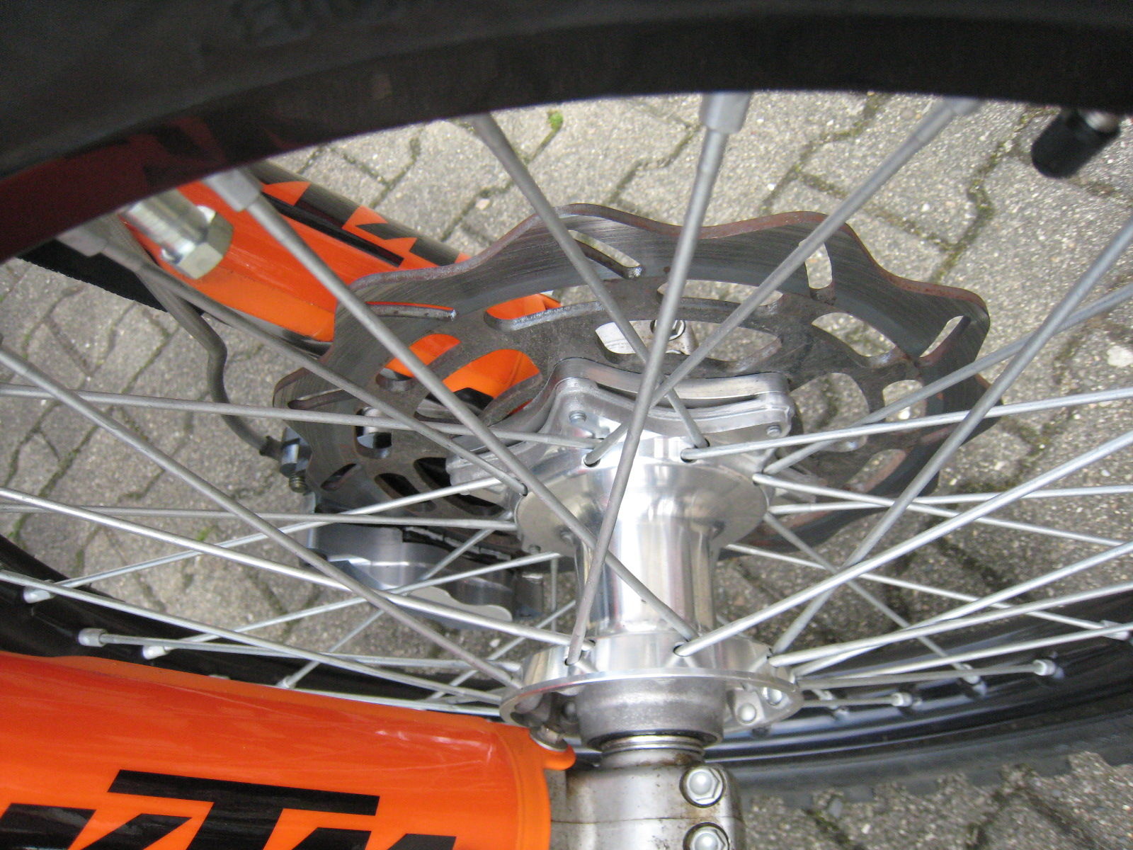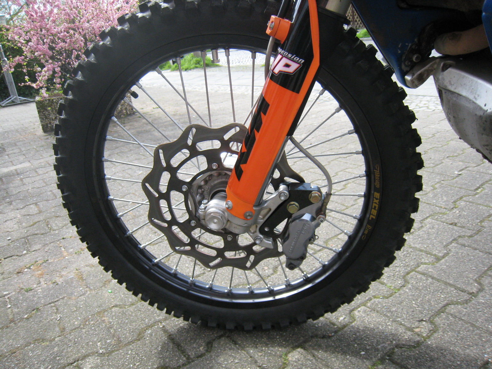 auf dem Foto ist eine triumph tiger mit EXc Gabel und Vorderrad, da das alles 26 mm ist passen die Räder einer EXC,LC8 Superenduro LC4 ab 2004 usw zueinander .die frage ist immer nur ob 1 Scheibe oder 2.