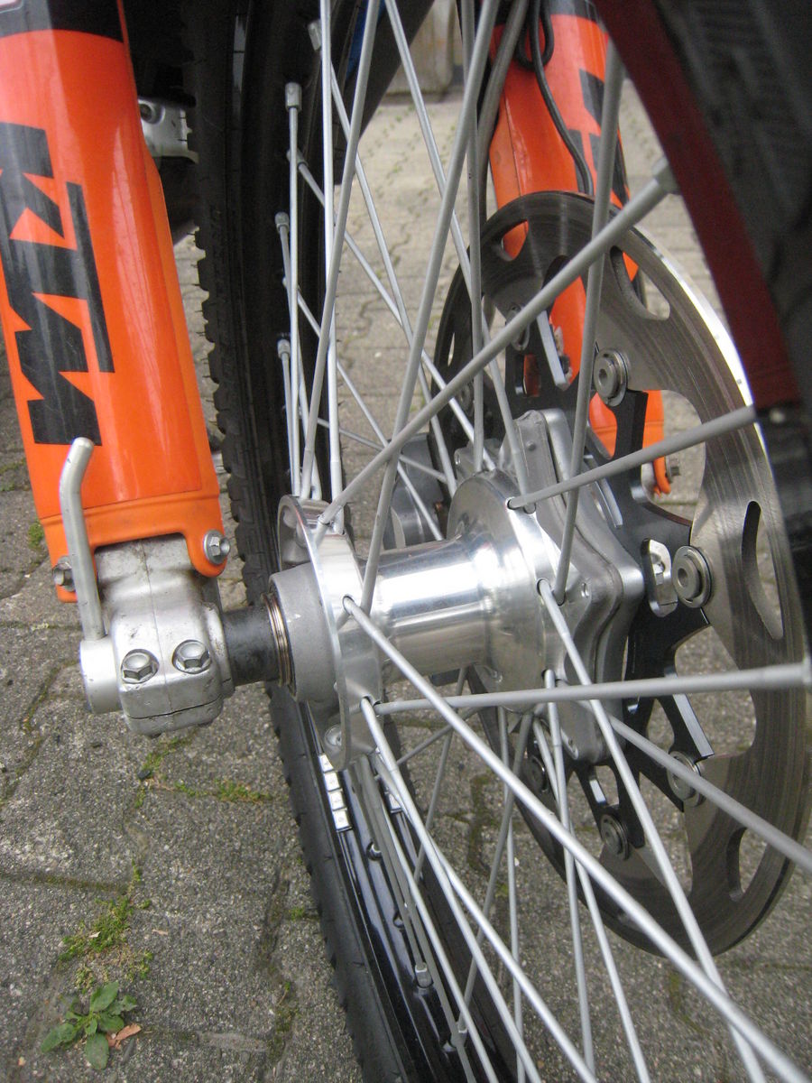 1500 km vergleichsfahrt mit 1 Scheibe 320 und eXC Bremsanlage - es reicht und das Moped ist mit der 1.6er Felge vorne und MT 90 IN DEN Alpen wesentlich handlicher als die Serie - Meinung von mir und Zwergenfactory der mit der orginalen 03 als referenz mit war - schneller war trotzdem auf beiden Maschinen .. unsure