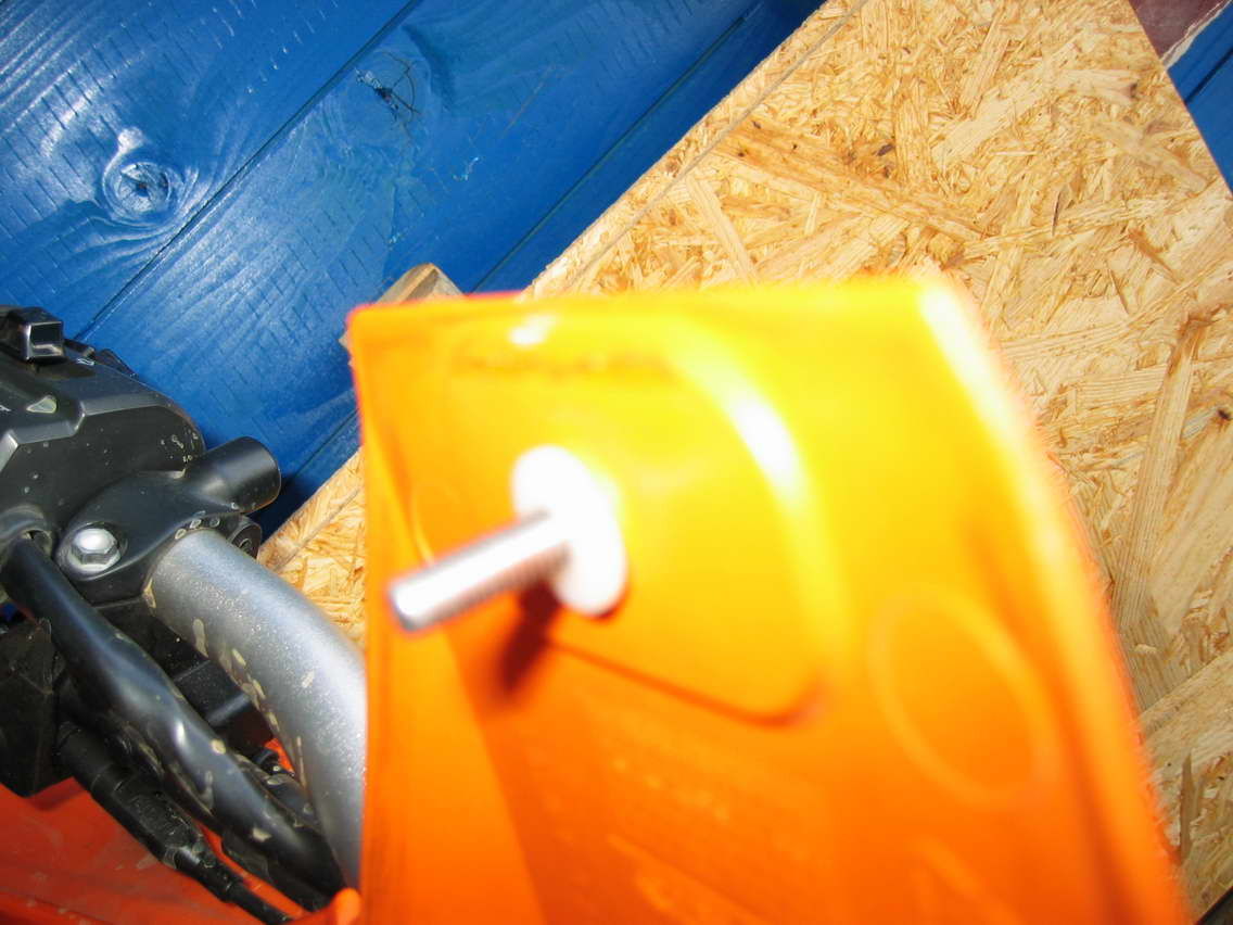| Genau! Für die Schraube habe ich übrigens 2 Kunststoffscheiben benutzt, oben M6, schützt den Lack, unten M5, verhindert das Verlieren. Die Blindnietmutter ist wie die Schraube aus VA, gammelt so nicht.
