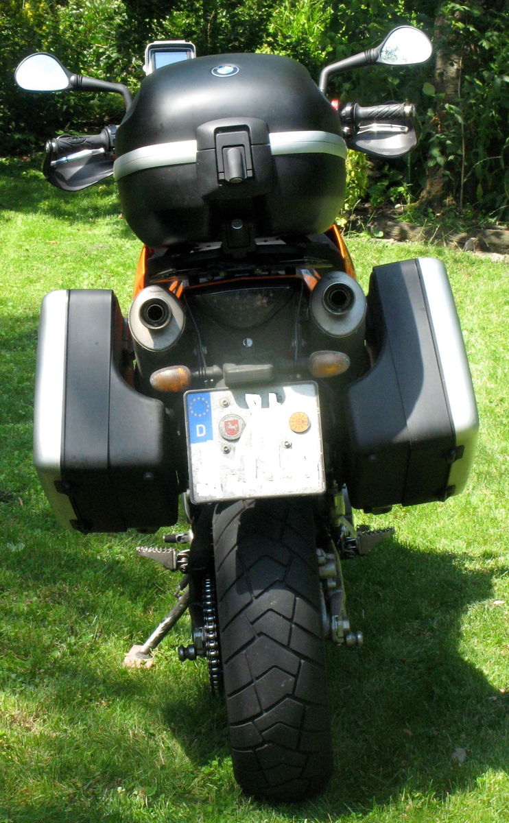 Die abgebildeten Anbauten fahre ich jetzt seit rund 3000 km, in das Topcase passt auch der Shoei XR1100, darum ist das Vario-Topcase von der 1100 GS nicht mehr drauf. Außerdem kriegt man das nicht gleichschließend mit den Koffern. Und wenn es schon optisch nicht perfekt ist, soll es ja wenigstens funktional stimmen ;-)